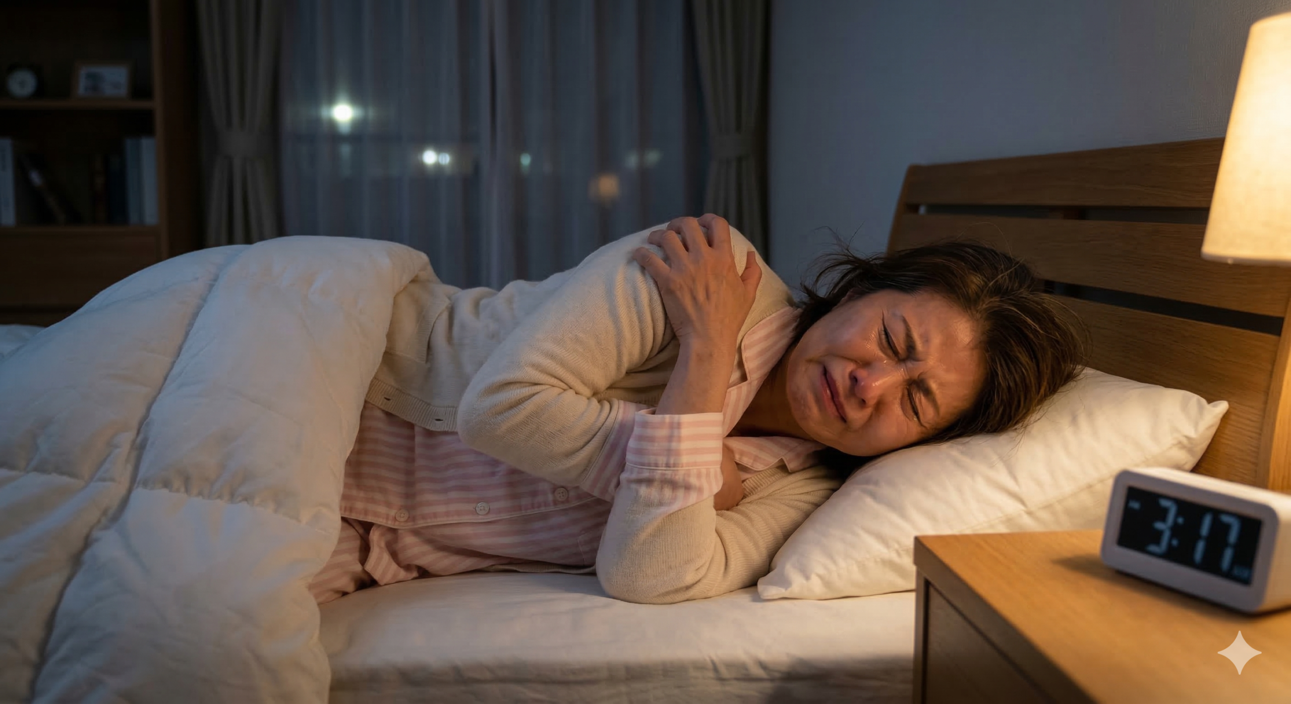 今回のテーマである「夜中の強い痛み」は、この初期段階(炎症期)の症状です。 - 拘縮期